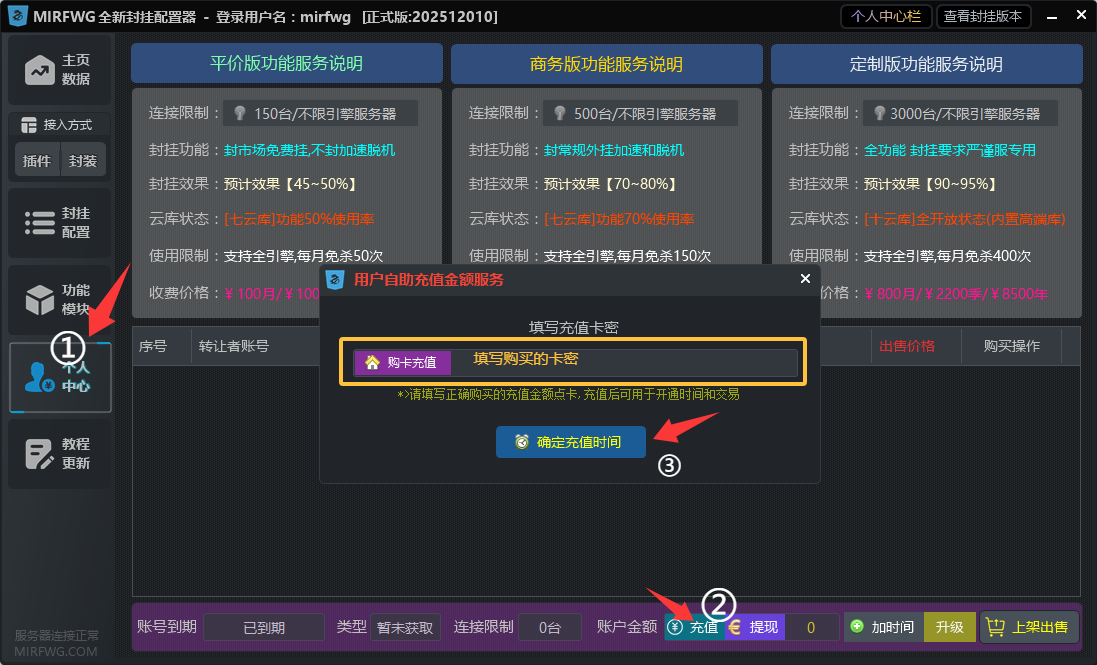 【第三步】1、登录后点击个人中心--点击充值按钮--然后填写购买卡密-点击确定充值